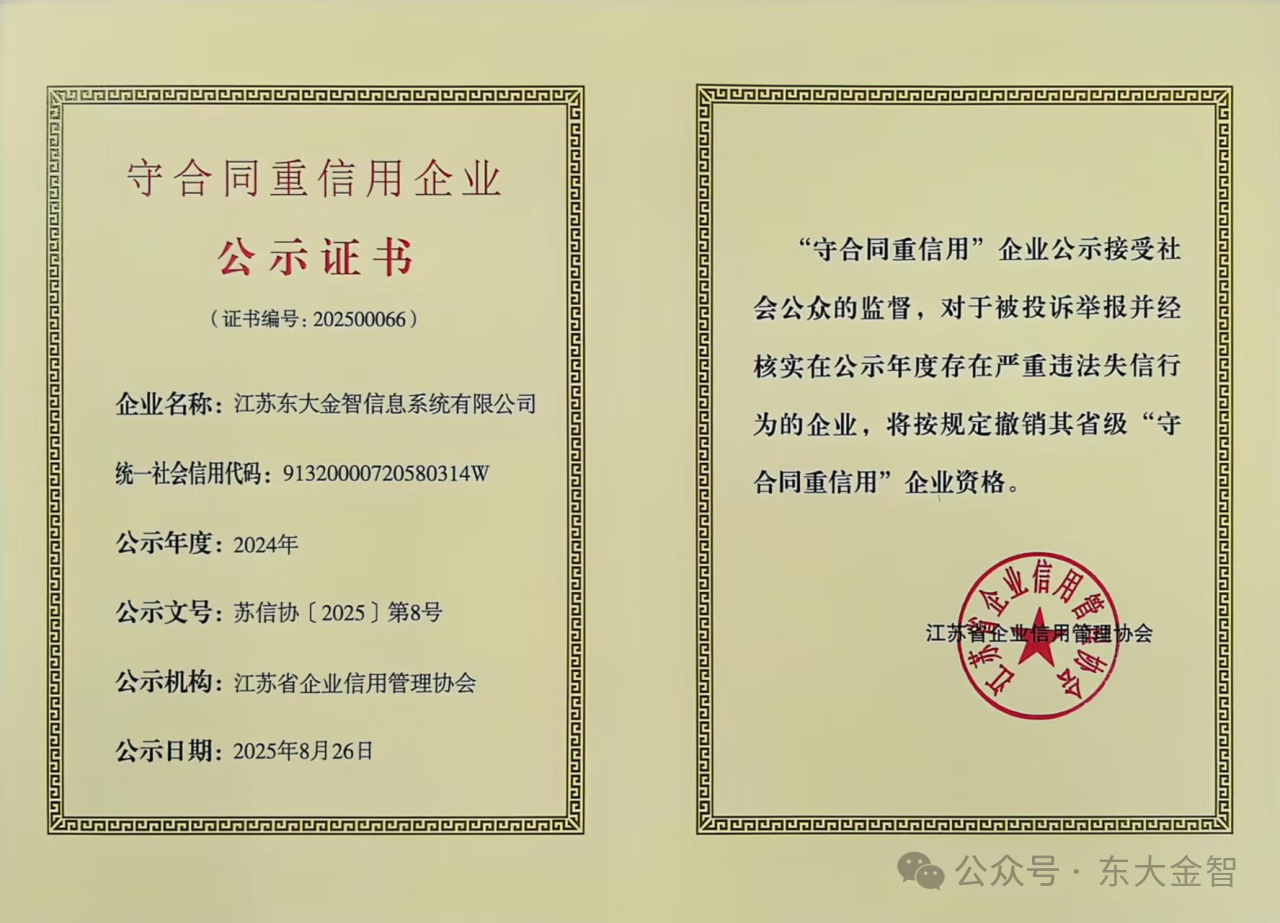 这份荣誉是对我公司坚持守合同重信用理念,践行诚实守信和依法经营生产的认可,金智信息将一直坚守初心,不断推进诚信体系的建设。